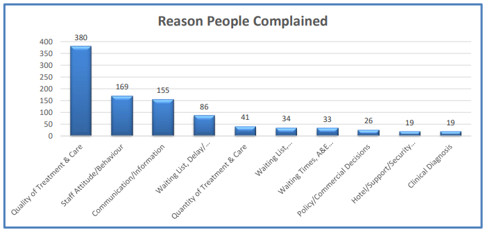The chart below shows the number of complaints by subject in 2024/2025. The top 3 reasons why people complained were Quality of Treatment & Care, Staff Attitude/Behaviour and Communication/Information.