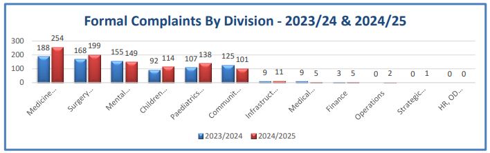 The services provided by the NHSCT are organised into 12 Divisions. The graph below shows the distribution of complaints across these Divisions over the past year 2 years.
