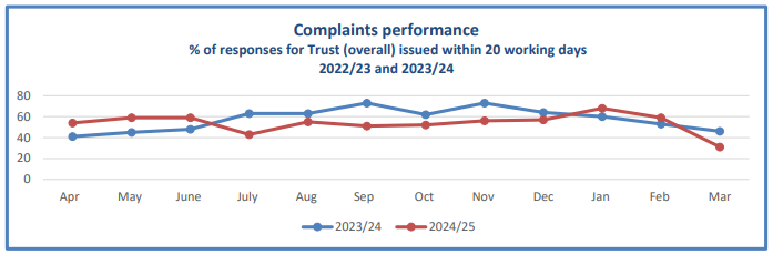 During 2024/2025, 54% of complaints were responded to within 20 working days which is a decrease of 5% from the previous year. 100% of complaints were acknowledged within 2 working days.